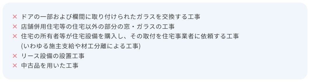 ただ、補助の対象とはならないリフォーム工事もあります。店舗併用住宅等の住宅以外の部分の窓・ガラスの工事や新築物件などは補助の対象にならないので注意しましょう。