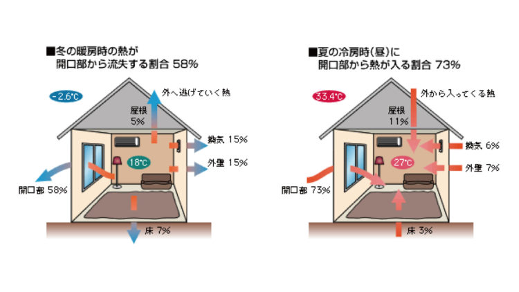 日本建材・住宅設備産業協会のデータによると、日本で多く使われているアルミフレームの複層ガラスの窓の場合、開口部からの熱の流入は冬が58%、夏が73%とされています。