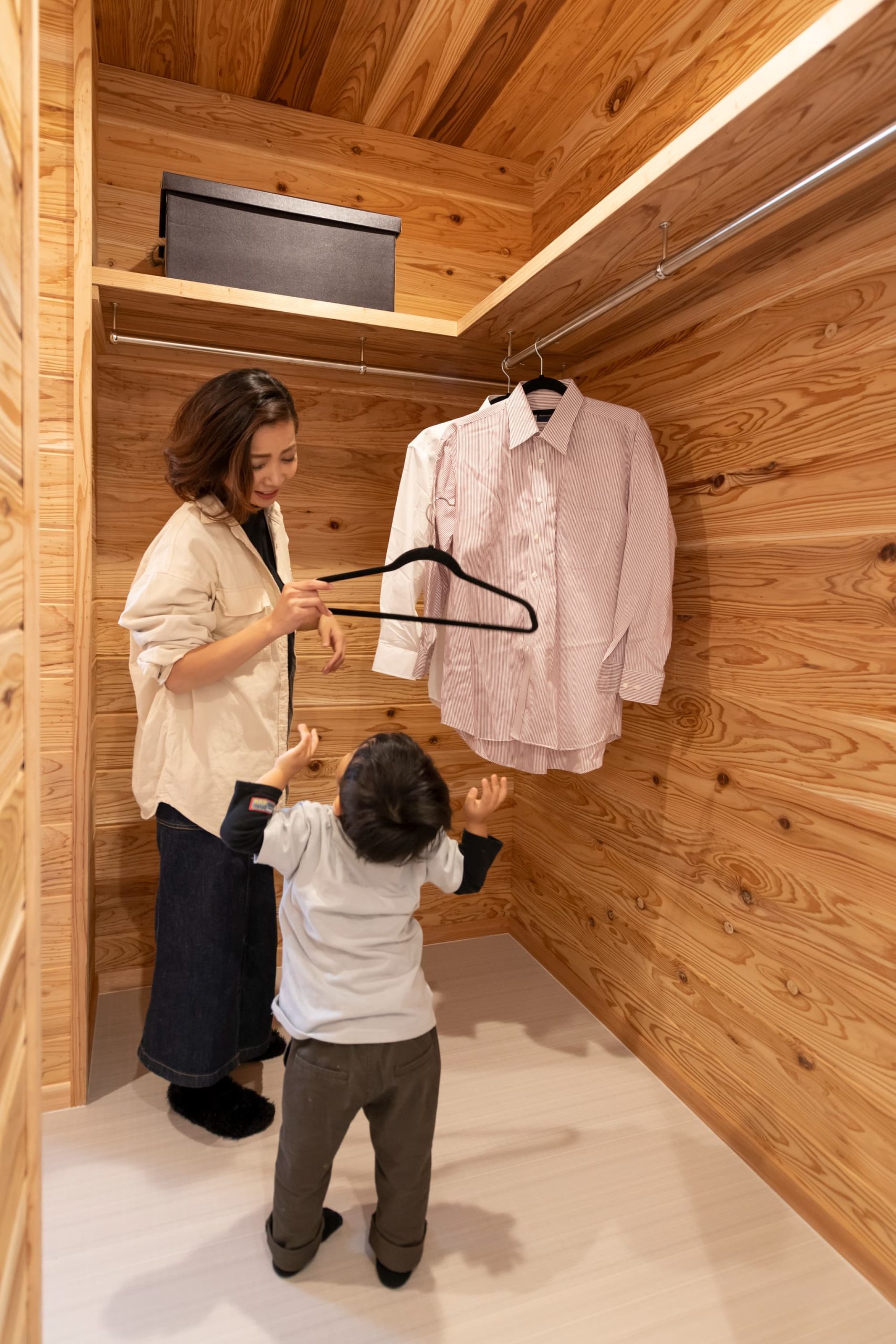 板張りのウォークインクローゼットは、木材を使用した温かみのあるデザインが特徴です。木の質感が空間に自然な雰囲気をもたらし、落ち着いた空間を作り出します。