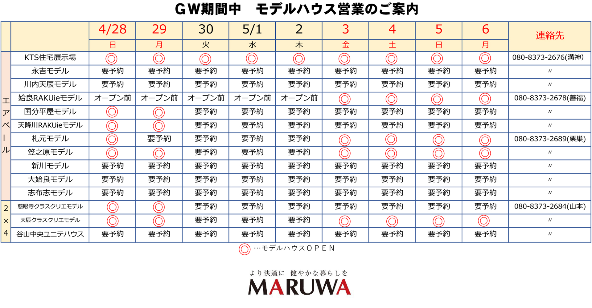 information イベント情報・お知らせ HOMEイベント情報・お知らせGW期間中のモデルハウス営業のご案内 2024.04.26 GW期間中のモデルハウス営業のご案内 平素は格別のご高配を賜り誠に有難うございます。 ゴールデンウィーク期間中のモデルハウス営業は下記の通りとなります。 この機会に是非お越しくださいませ。
