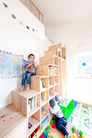 →(奥様)階段に収納を置くことで床におもちゃが散らからなくなったことと、自分の目線のところに自分の本とかを子ども達が自分で片づけるようになりました。