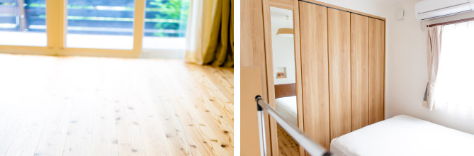 →(奥様)もう標準装備で、天井・壁はもちろんのこと押入れ、収納あらゆる全てまでが漆喰でできるということと、床も基本は無垢材っていうところが一番大きな決め手でした。