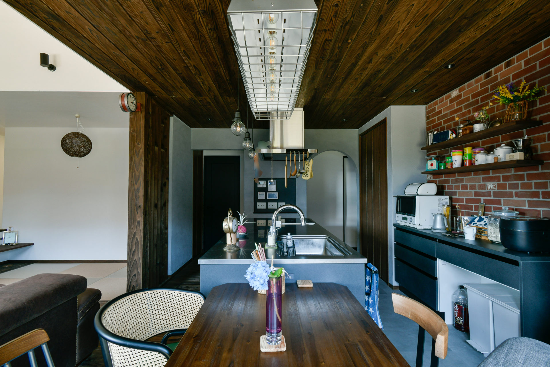 暗い色味の天然木により落ち着きのあるLDK空間