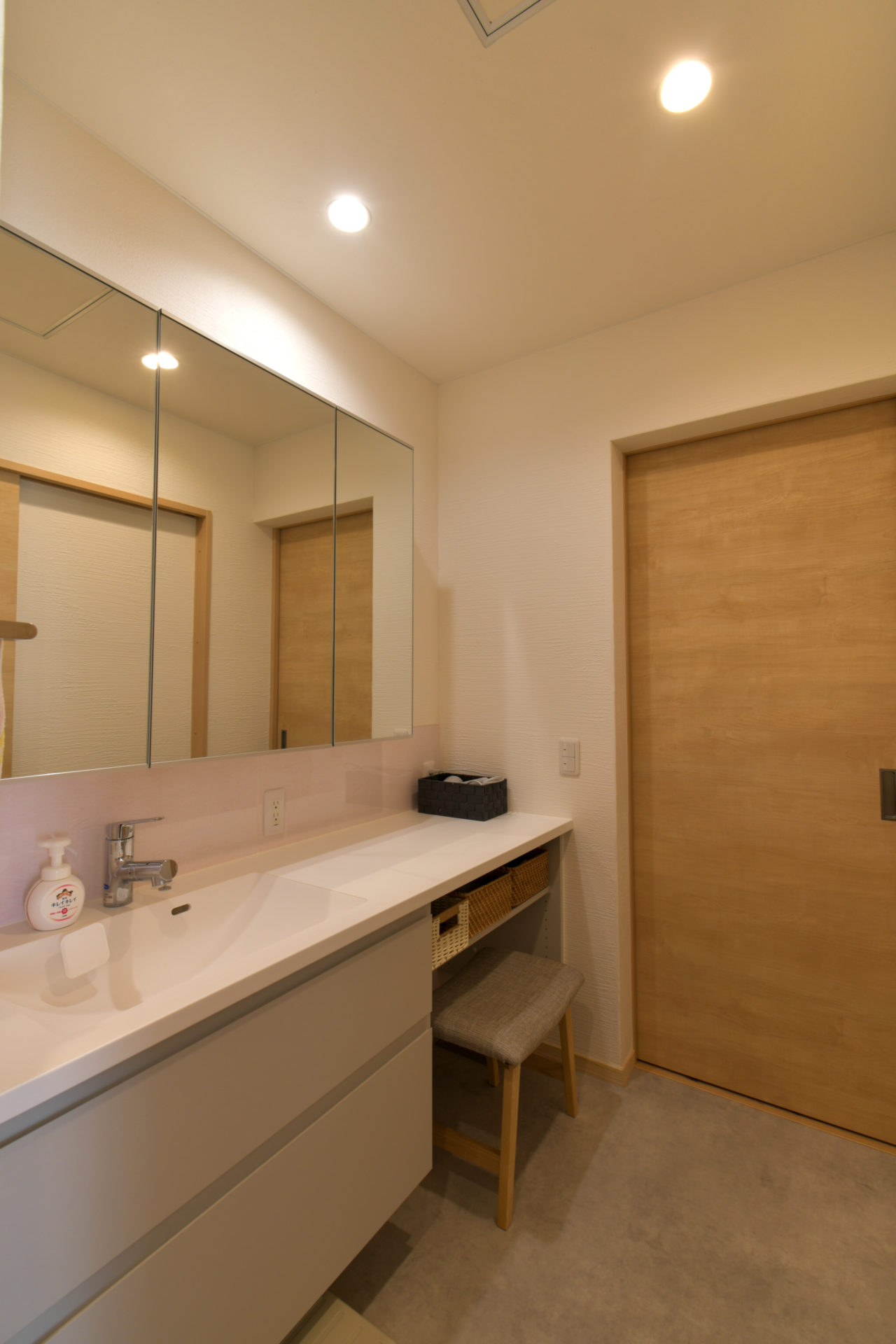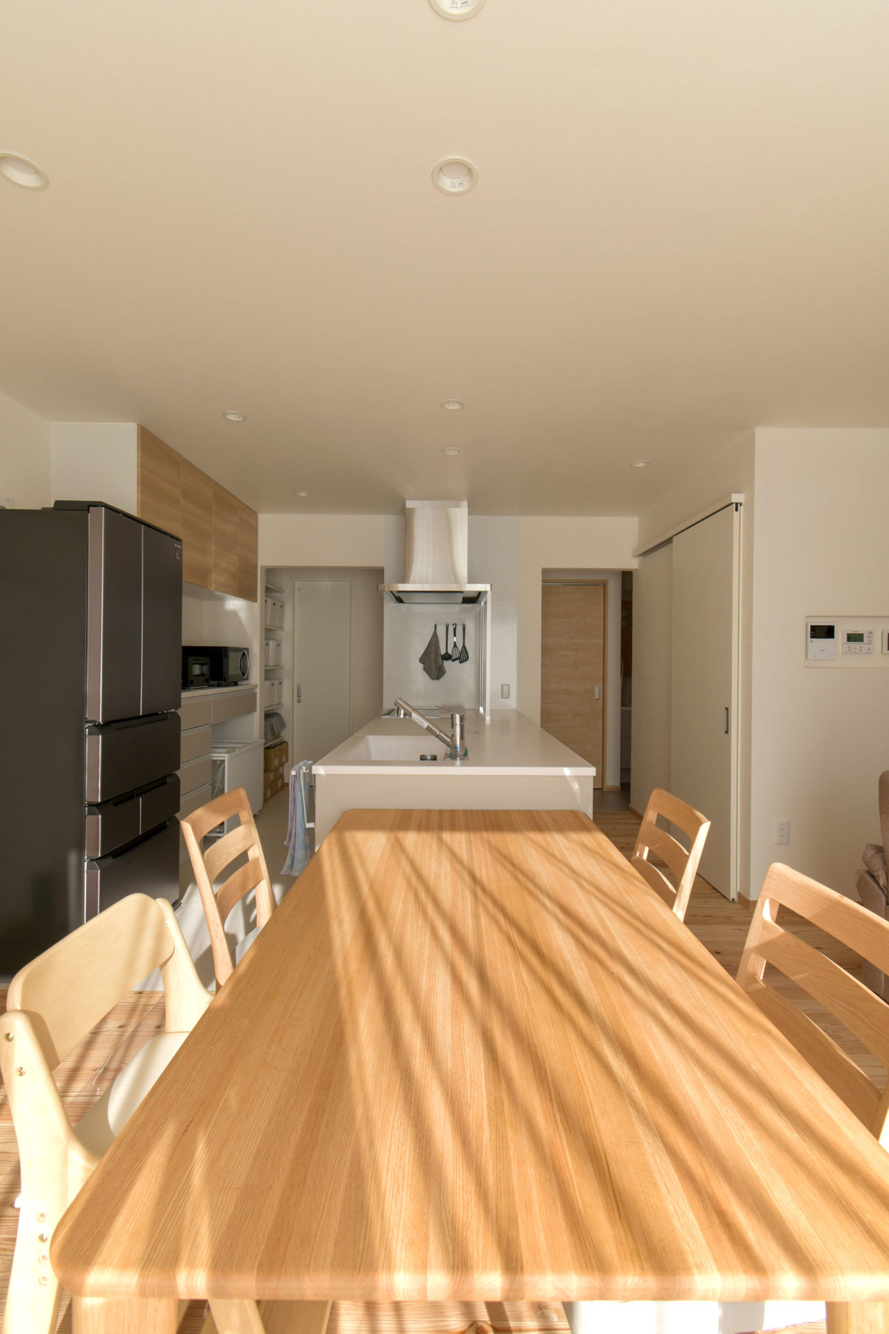 家族のお気に入りはダイニング横に備えた大きな窓。採光が良く、LDK全体に自然光が溢れています。キッチンは、収納量たっぷりのパントリーに加え、前面にも収納を設けることで利便性も実現。ダイニングとキッチンが横並びになっているため、家事が楽な導線設計を工夫しました。